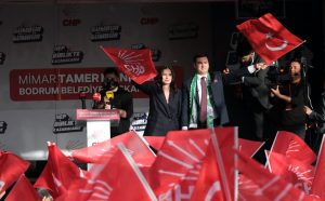 Kürsüye eşi Sezil Mandalinci ile çıkan CHP Bodrum Belediye Başkan adayı Tamer Mandalinci, “Her başarılı erkeğin arkasında bir kadın vardır derler. Benim arkamda ise çok kadın var. Eşim var, annem var, babaannem var, anneannem var. Hepsine çok teşekkür ediyorum” diyerek konuşmasına başladı.