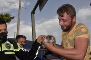Turizmci Mustafa Kemal Çubuk, otomobiliyle seyir halindeyken kedi sesi duyması üzerine Lise Kavşağı’nda durdu. Diğer sürücülerin de yardımıyla kedinin aracın motor bölümünde olduğu anlaşıldı.