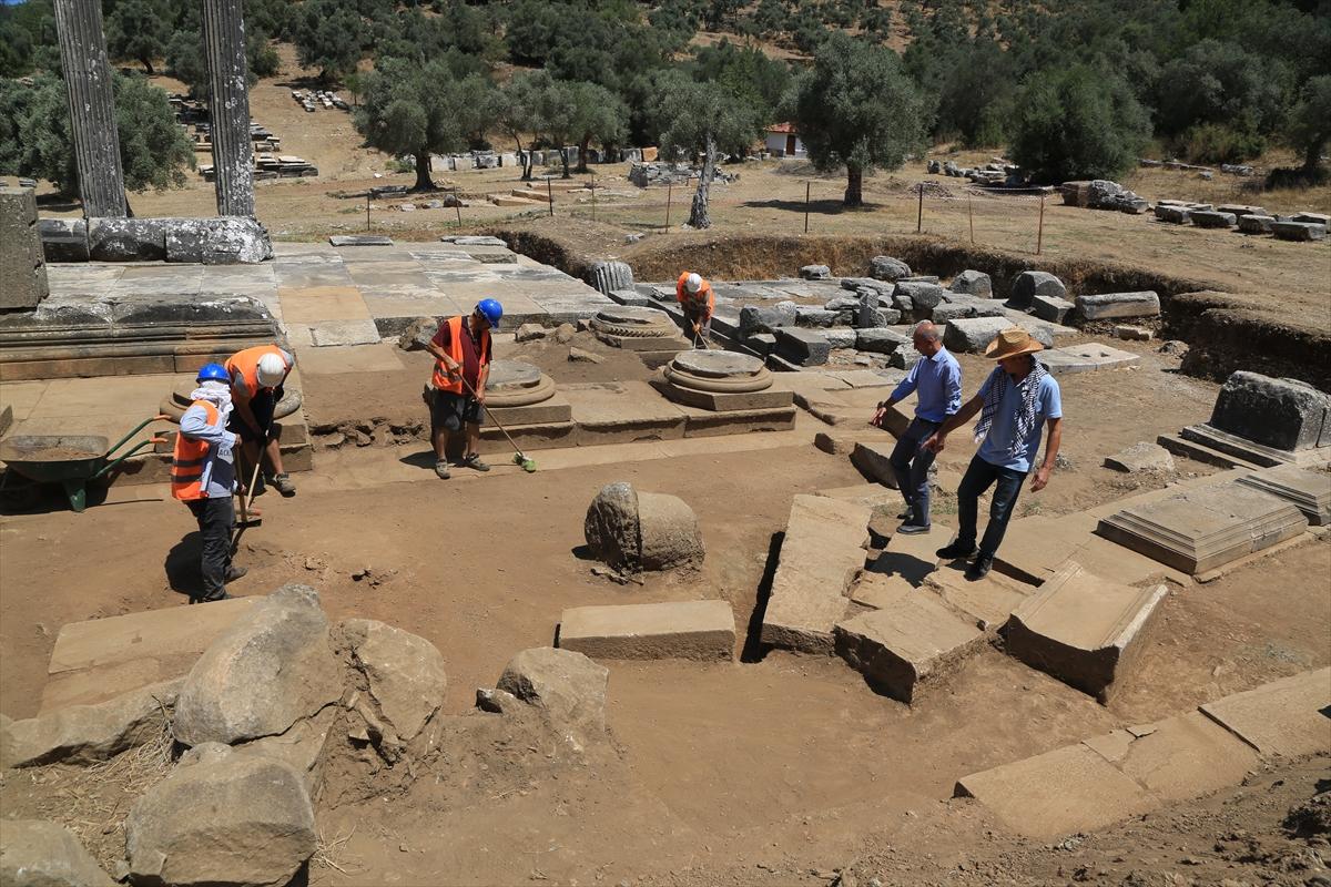 “Tapınağın güney cephesinde üst üste yığılmış yaklaşık 250 bloğu yerlerinden alarak restorasyon çalışmalarında kullanılmak üzere uygun alana taşıdık. O iş bittikten sonra toprak altında mimari bloklar olduğunu umarak kazı çalışmasını başlattık. Mimari blokları beklerken büyük sürprizlerle karşı karşıya kaldık. Toprak altından 2 heykel, bir de yazıt çıktı. Tüm bunlar bizi çok heyecanlandırdı. Aslında sadece bizi değil arkeoloji camiasını da heyecanlandırdı. Çünkü Karya bölgesinin eksik olan arkaik dönem heykeltıraşlığının çok önemli iki halkasını ve bir de Helenistik döneme tarihlenen bir yazıtı burada gün yüzüne çıkardık.”