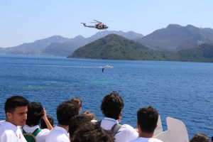Sahil Güvenlik Komutanlığının gerçekleştirdiği faaliyetler ve görevler hakkında da bilgilendirilen gençler senaryo gereği denize bırakılan kazazedenin Sahil Güvenlik helikopteri ile kurtarılmasını ve helikopter tarafından TCSG-UMUT gemisinin helikopter platformuna transfer edilerek müdahale edilmesini ilgi ve heyecanla izledi.