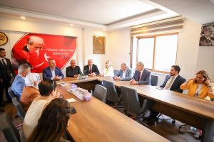 MHP İl Başkanı Mehmet Korkmaz ve Yönetim Kurulu üyeleri tarafından parti girişinde karşılanan Çavuşoğlu, burada da bir süre Korkmaz ve partililerle sohbet etti.