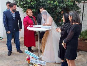 Bodrum Belediye Başkan Yardımcısı Ummahan Yurt kıydığı nikah sonrasında, Başkan Ahmet Aras adına mutluluklar dileyerek nazar boncuğu hediye etti.