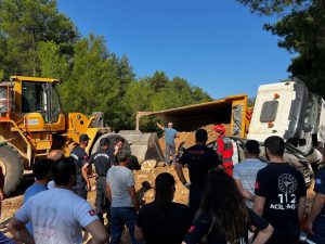 İhbarın ardından kaza yerine sağlık, jandarma ve itfaiye ekipleri sevk edildi. Hayati tehlikesi bulunmayan kamyon sürücüsü Fikret Ç., ilçedeki özel bir hastaneye sevk edildi. İş makinesi ve küreklerle minibüsün üzerine boşalan toprak boşaltılmaya çalışıldı. Zaman karşı yarışın yapıldığı kaza yerine vinç geldi. Zincirlerle vince bağlanan kamyon, alttan da iş makinesinin desteğiyle kaldırıldı.