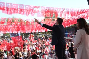 Meydanını dolduran, Türk Bayrakları ve parti bayraklarıyla alanı renklendiren kalabalık, “Tamer Başkan” sloganlarıyla Tamer Mandalinci’yi karşıladı.