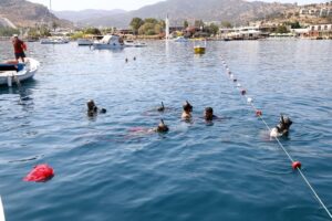 Bodrum Belediyesi Destek Hizmetleri ve Temizlik İşleri Müdürlüğü organizasyonuyla “Denize En Çok Mavi Yakışır” sloganıyla gerçekleşen deniz dibi temizliği bu hafta Gündoğan koyunda gerçekleşti.