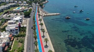 Son olarak Muğla Büyükşehir Belediyesi tarafından asfalt çalışmaları yenilenen 2 bin 900 metrelik bisiklet ve koşu yolu, Bodrum Belediyesi Fen İşleri Müdürlüğü ekiplerince çevreye zararlı olmayan özel bir boya ile boyanarak tamamlandı. Bodrum Belediyesi Destek Hizmetleri Müdürlüğü atölyelerinde üretilen 28 bank, 29 çöp kovası ve 26 küllük de belirli aralıklarla sahil şeridine yerleştirildi.