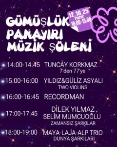 Sunuculuğunu Mihriban Er’in üstlendiği Gümüşlük Panayırı’nda Tuncay Korkmaz, “7’den 77’ye”, Dilek Yılmaz-Selim Mumcuoğlu, “Zamansız Şarkılar”la, Maya-Laja-Alp Trio, “Dünya Şarkıları” ile sahne alacak. Yıldız ve Güliz Asyalı’dan oluşan Two Violins grubu keman performansı sergilerken, Recordman, nadide plaklardan oluşan koleksiyonuyla panayır ziyaretçilerine müzik ziyafeti çekecek.