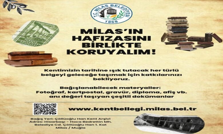Hayata geçirilen çalışmayla vatandaşlarımız Milas’ın tarihine ışık tutacak materyalleri Milas Belediyesi’ne bağışlayabilecek. Bu çalışmayla geçmişten günümüze ve geleceğe bir köprü kurmayı hedefleyen Milas Belediyesi tarafından tüm vatandaşlarımıza katkı sunmaları için çağrı yapıldı. Projeye katkıda bulunmak isteyen vatandaşlarımız Hisarbaşı – Hocabedrettin Mahallesi, Belediye Caddesi Çöllüoğlu Hanı 1. katta bulunan Çöllüoğlu Kent Arşivi’ne fotoğraf, kartpostal, gravür, diploma, afiş, vb anı değeri taşıyan çeşitli dokümanları teslim edebilecek. Arşiv sistemine ulaşmak isteyen vatandaşlarımız ise afişteki karekodu okutabilecek.