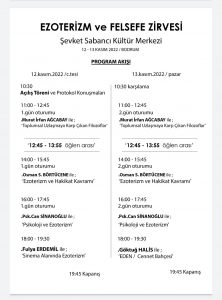 Grimoir Akademi ve Sev Medya iş birliği ve Bodrum Belediyesi’nin destekleriyle Ezoterizm ve Felsefe Zirvesi, 12-13 Kasım tarihlerinde Turgutreis Şevket Sabancı Kültür ve Sanat Merkezi’nde gerçekleştirilecek. Toplantıda, konusunda Türkiye’nin en popüler akademisyen ve eğitimcilerinden Murat İrfan Ağcabay, Göktuğ Halis, Osman S.Börütecene, Can Sinanoğlu ve Fulya Erdemil konuşmacı olacak.